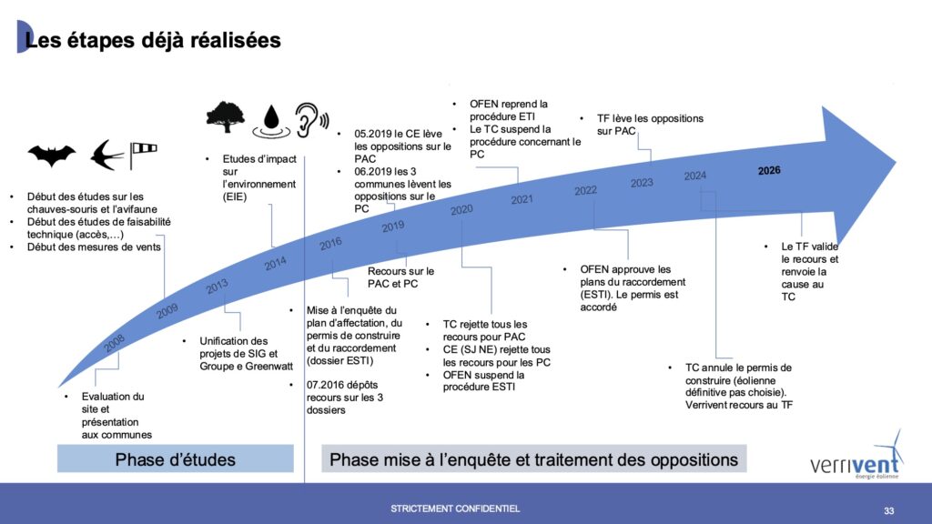 Le projet a démarré dès 2008 avec l’évaluation du site et les premières mesures de vent. Après l’unification des projets de SIG et Groupe e Greenwatt, des études d’impact sur l’environnement ont été menées. Le dossier a ensuite été mis à l’enquête publique en 2016, suivi d’une longue série de recours. Le Tribunal fédéral a finalement validé le plan d’affectation cantonal (PAC) en octobre 2023. Le raccordement au réseau, lui, est définitivement autorisé.
