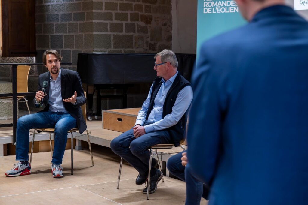 Comment accélérer le développement de l’éolien en Suisse romande? C’est autour de cette question que Jonas Schneiter a animé une table ronde (sans table) réunissant Lionel Perret (Suisse Eole), Olivier Petermann (syndic de Lignerolle) et Maxime Ramstein (Romande Energie). Les échanges ont rapidement mis en évidence trois enjeux récurrents: les procédures, l’acceptation locale et la coordination entre acteurs.